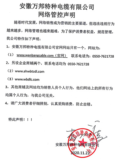 鄭重聲明:安徽萬邦特種電纜有限公司官方網站為:www_wanbangcable_com.mtianm.com,除此之外無任何子網站或合作網站,其余均為假冒偽劣。電話:0550-7621728 13485756353 地 址:安徽省天長市滁州高新技術產業開發區經四路29號
